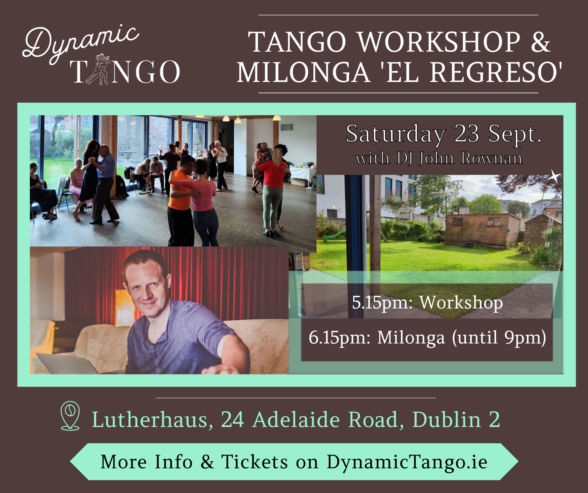6.30pm-9.15pm: Matinée Milonga with DJ John Location: Lutherhaus, 24 Adelaide Road, Dublin 2. Milonga Price
