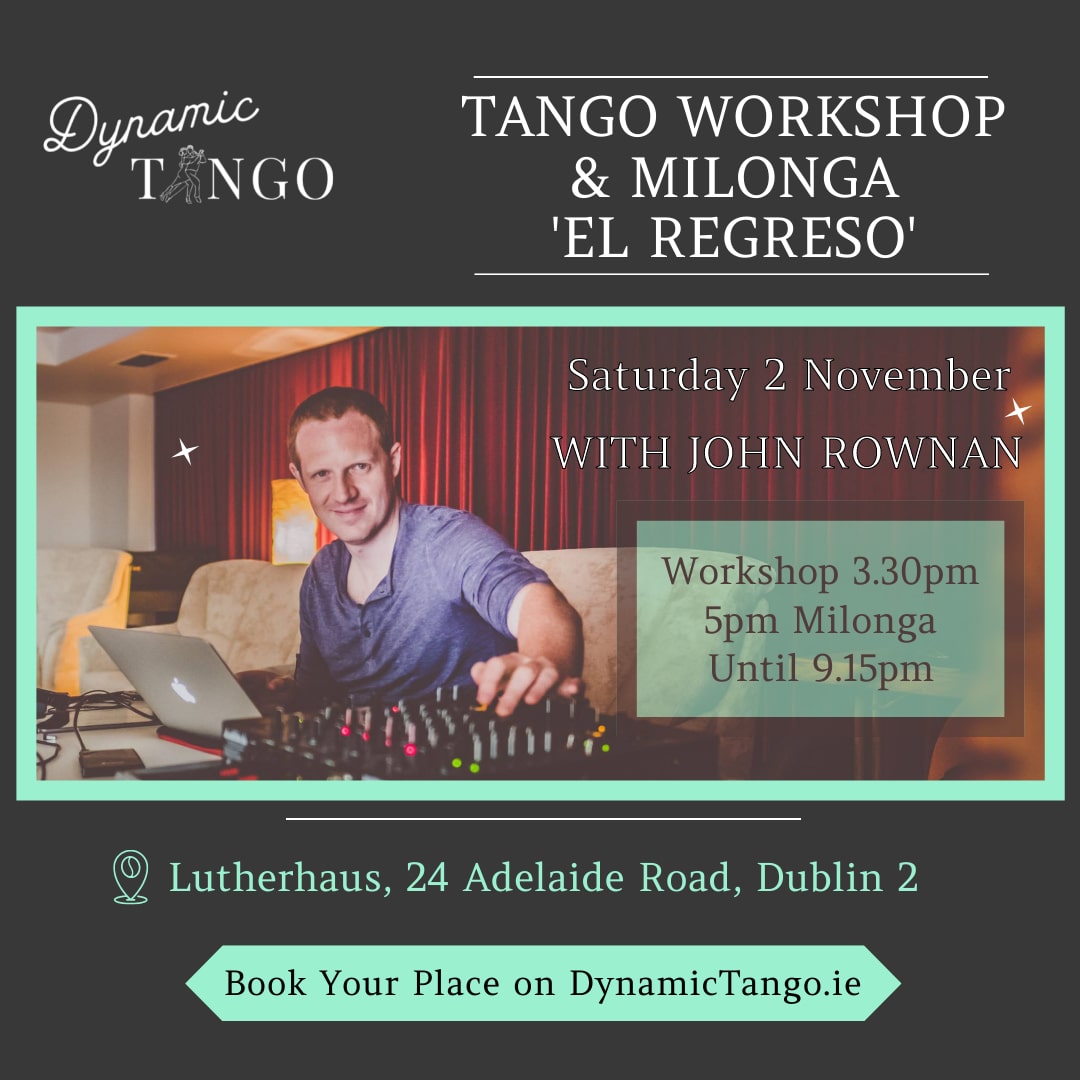 3.30pm-5pm: Tango Workshop 5pm-9.15pm: Milonga with DJ John Rownan. Half-price milonga for all thanks to